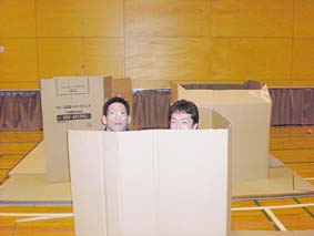 最後に、ダンボールや、新聞等を使ったアトラクションがずらり!!その中の、新聞紙のプール(新聞紙を破って集めたプール)につきました。プールの中で寝てしまったり、新聞紙を破ったり、撒き散らかしたり、一緒になって遊んでいると、1人の男の子と、女の子が着てくれました。心を開いてくれたのか、その男の子と一緒に遊んだり、破ったり、ロボットに新聞紙を投げたり、いつの間にか子供になって、遊んでいた自分がいました。